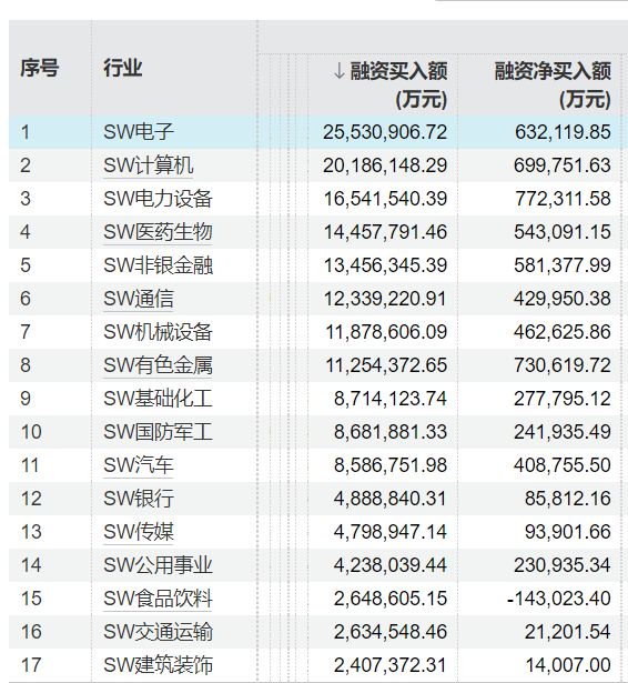 若从融资净买入额来看,电力设备、有色金额、计算机最受融资客青睐,当期融资净买入额分别达到77.23亿元、73.06亿元和69.98亿元。