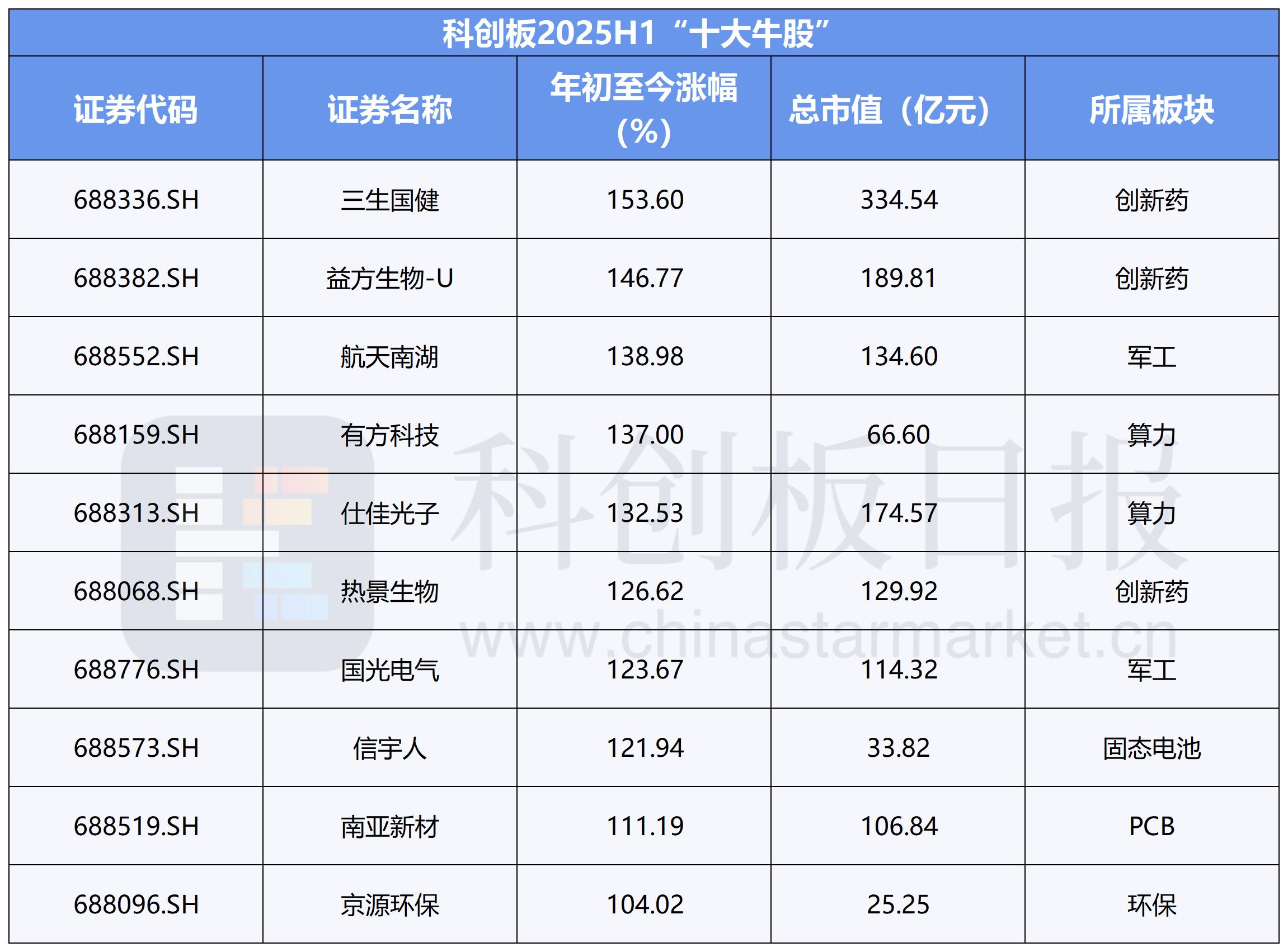 科创板2025上半年行情正式落幕,《科创板日报》统计了涨幅前十大个股(剔除次新股),其中三生国健居于榜首,与益方生物、航天南湖一并位列前三。