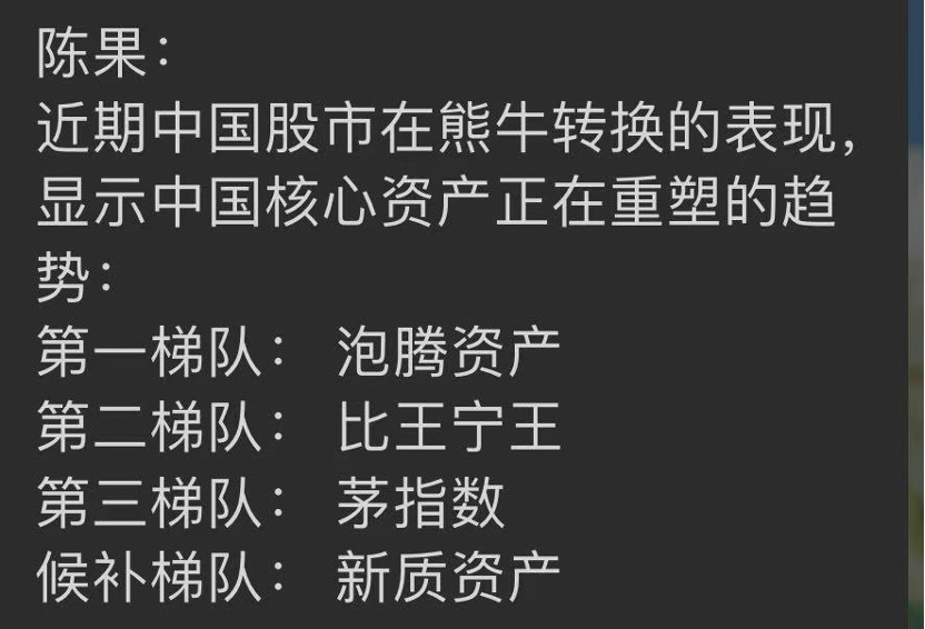 陈果则早在10月初就提出“泡腾资产”。他表示,“泡腾资产”代表了与老经济周期相关性低,有国际化运营能力,新消费服务、情绪消费领域核心公司,并称这将是“正在重塑的中国核心资产第一梯队”。