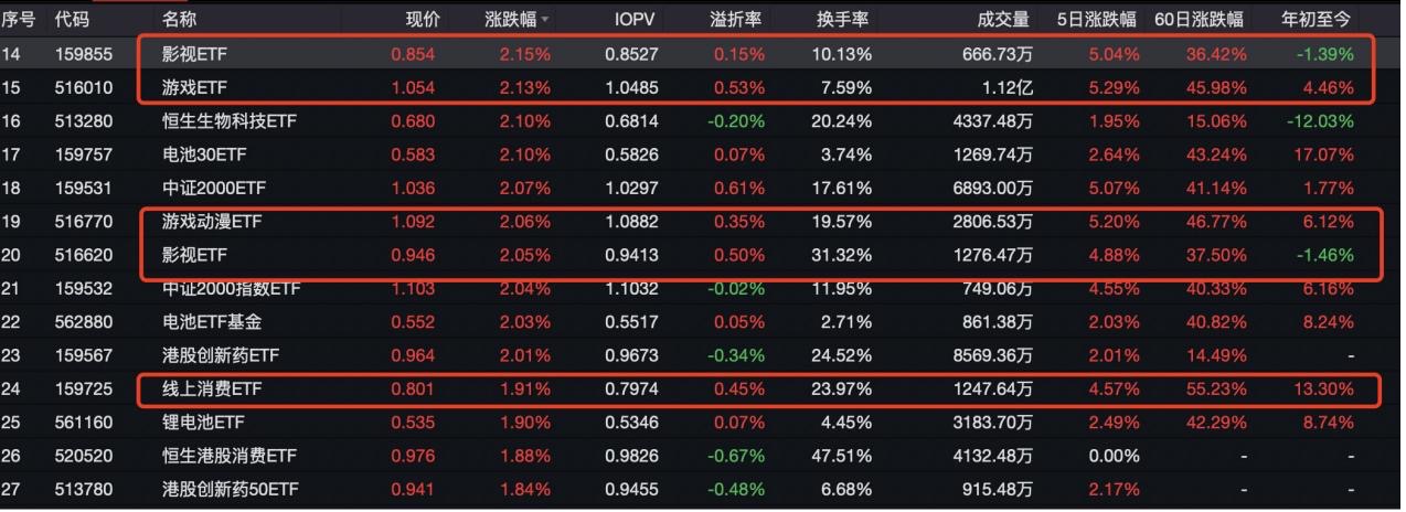 “谷子经济”概念股延续大涨,让影视ETF、游戏动漫ETF颇为受益,从近60日涨幅榜来看,多只相关主题ETF涨幅超过30%甚至40%以上。