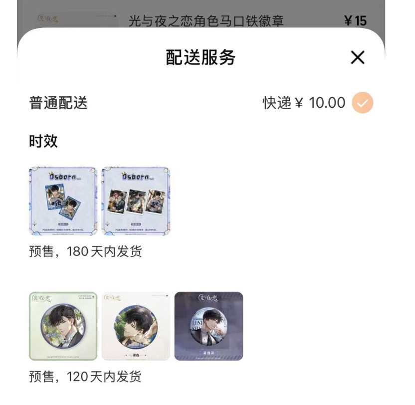 95后阿衡(化名)下单了《光与夜之恋》游戏最新款的角色马口铁徽章,这款徽章虽然价格不贵,却要等180天才能发货,也就意味着半年后才能拿到实物。