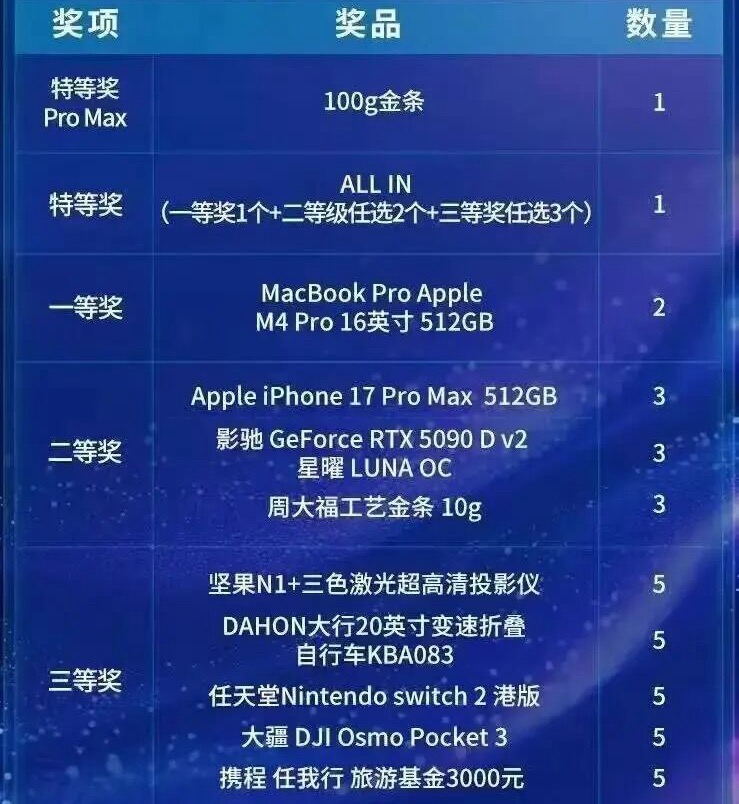 上海“F4”之一莉莉丝游戏今年的特等奖也是黄金,公司共送出5份30克的12周年定制金条,每根金条的价值超过3万元。此外,一等奖包括价值超过2万元的RTX 5090,二等奖和三等奖是iPhone 17 Pro Max和iPhone 17 Pro,共送出200份。