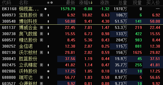 早盘铜缆高速连接器板块再次走强,博创科技一度涨超18%,续创历史新高,宝胜股份走出8天5板,博威合金、奥飞数据等跟涨。