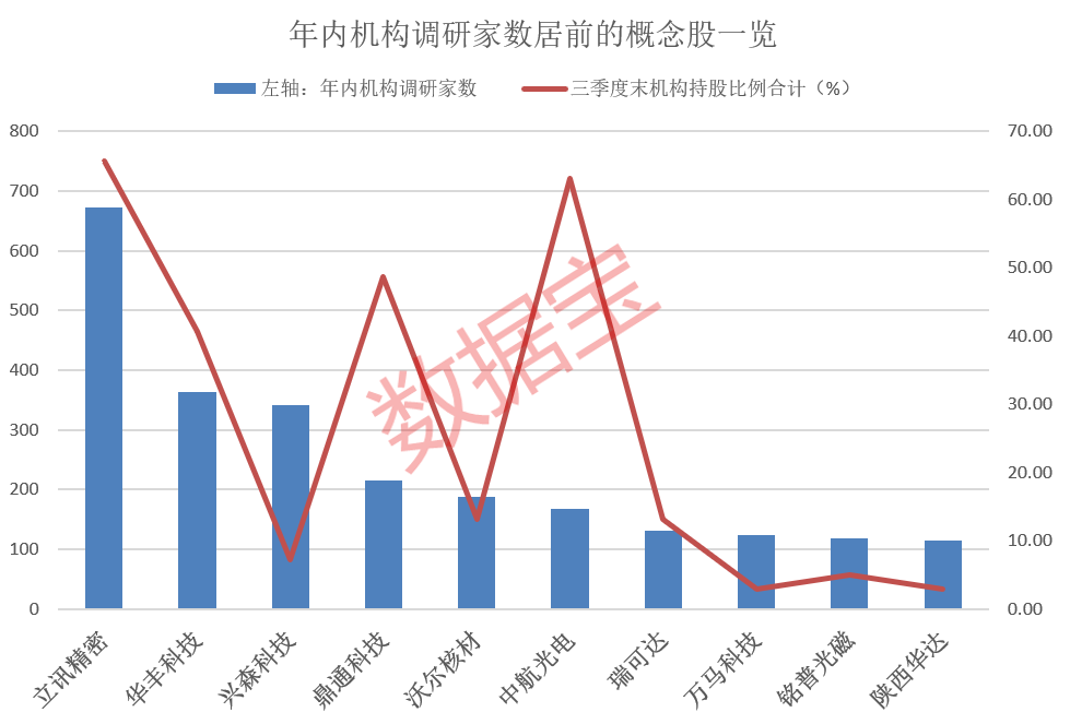 从机构持仓数据来看,三季度末,半数概念股的机构持股比例超30%,其中长飞光纤、立讯精密、胜蓝股份、四会富仕等6股的机构持股比例居前,均超60%。