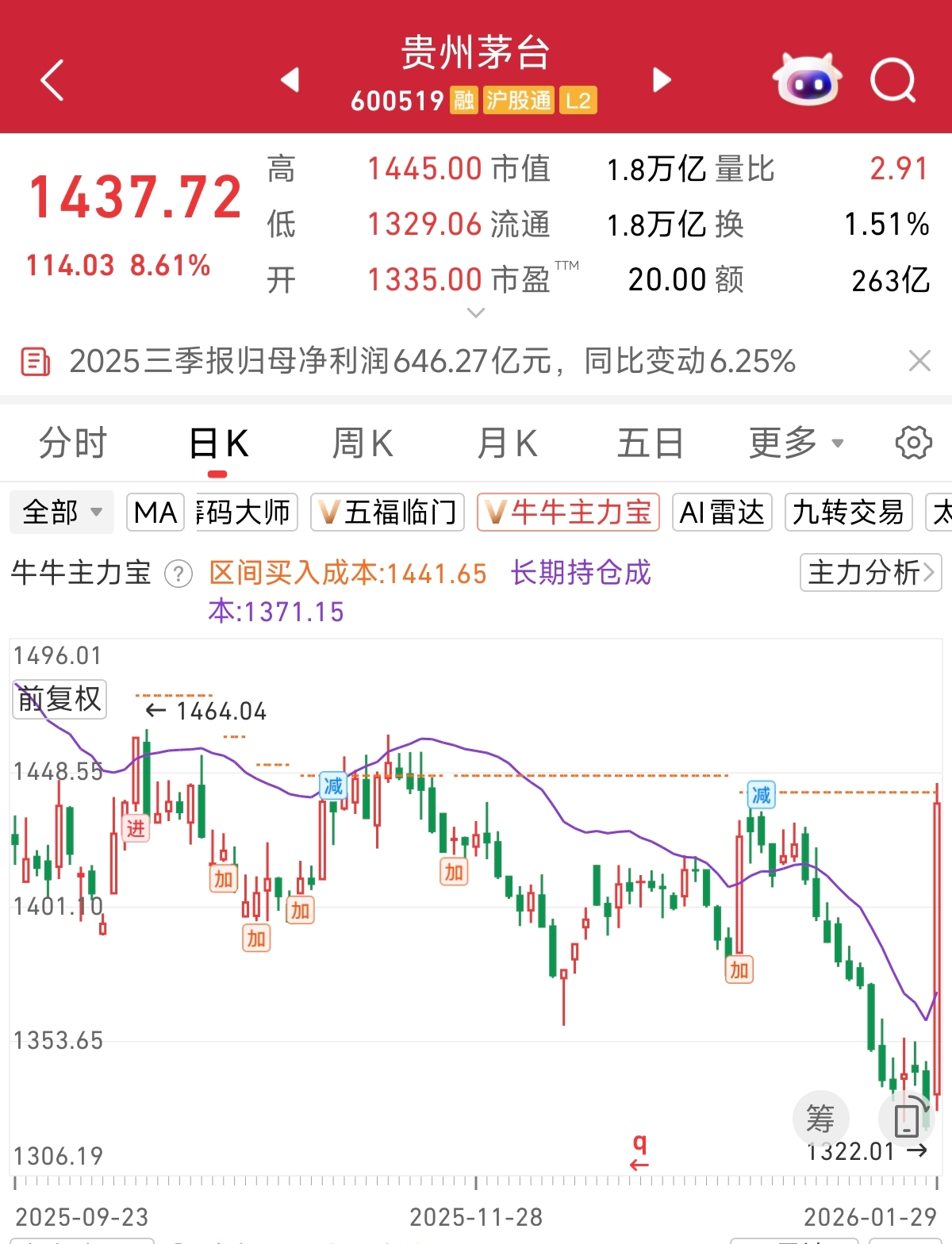 根据“主力宝”监控,今日大涨的贵州茅台,在25年10月份出现主力进场信号后,随着市场震荡下跌不断出现主力加仓减仓的信号,今日大涨后,依然低于主力的区间买入成本。