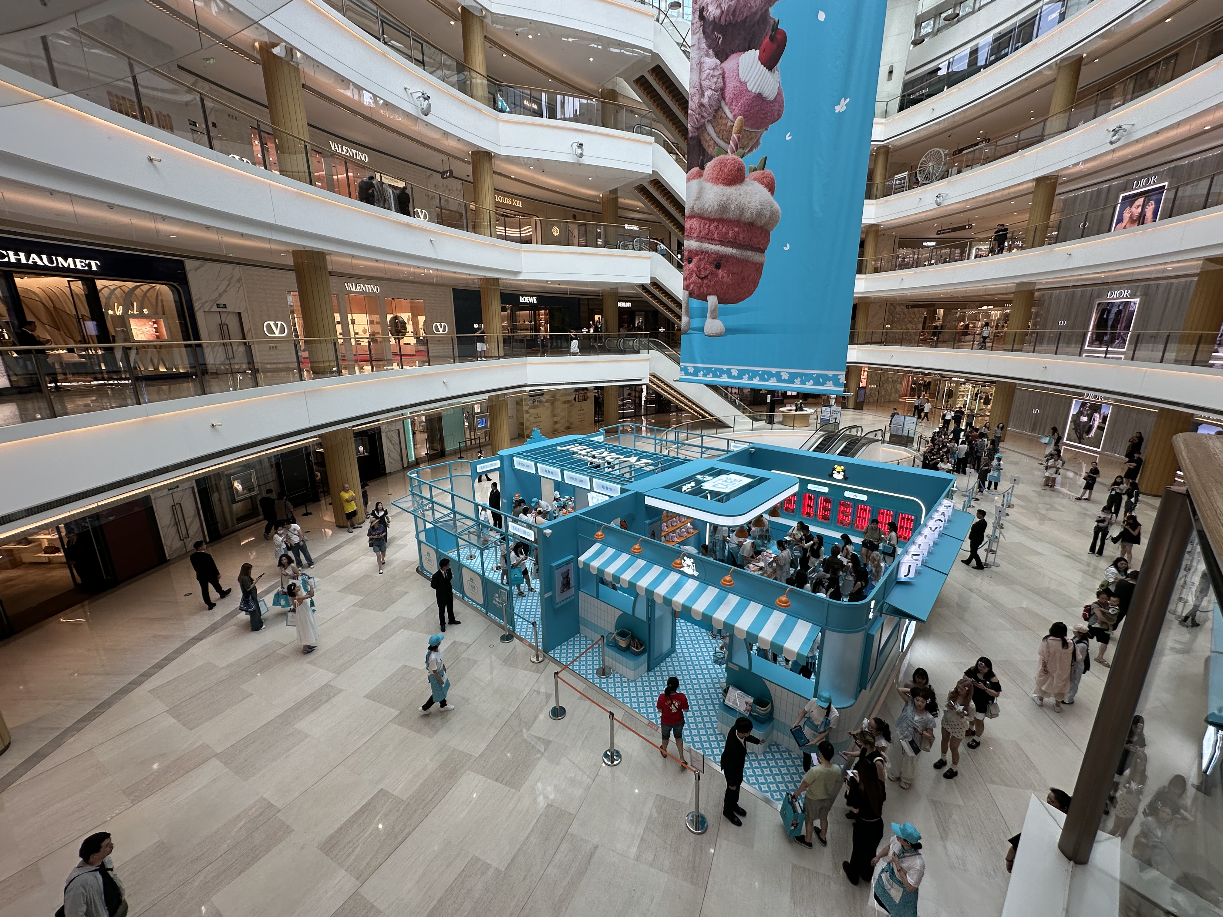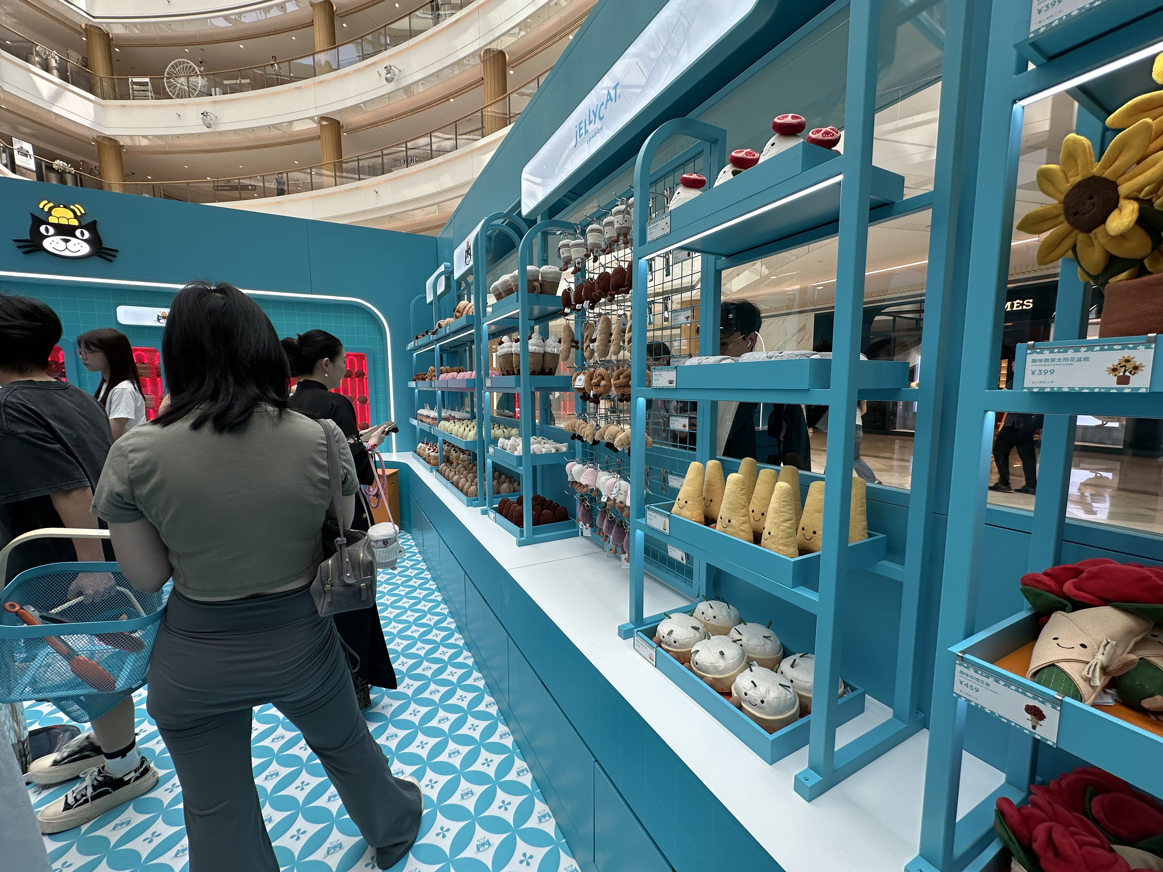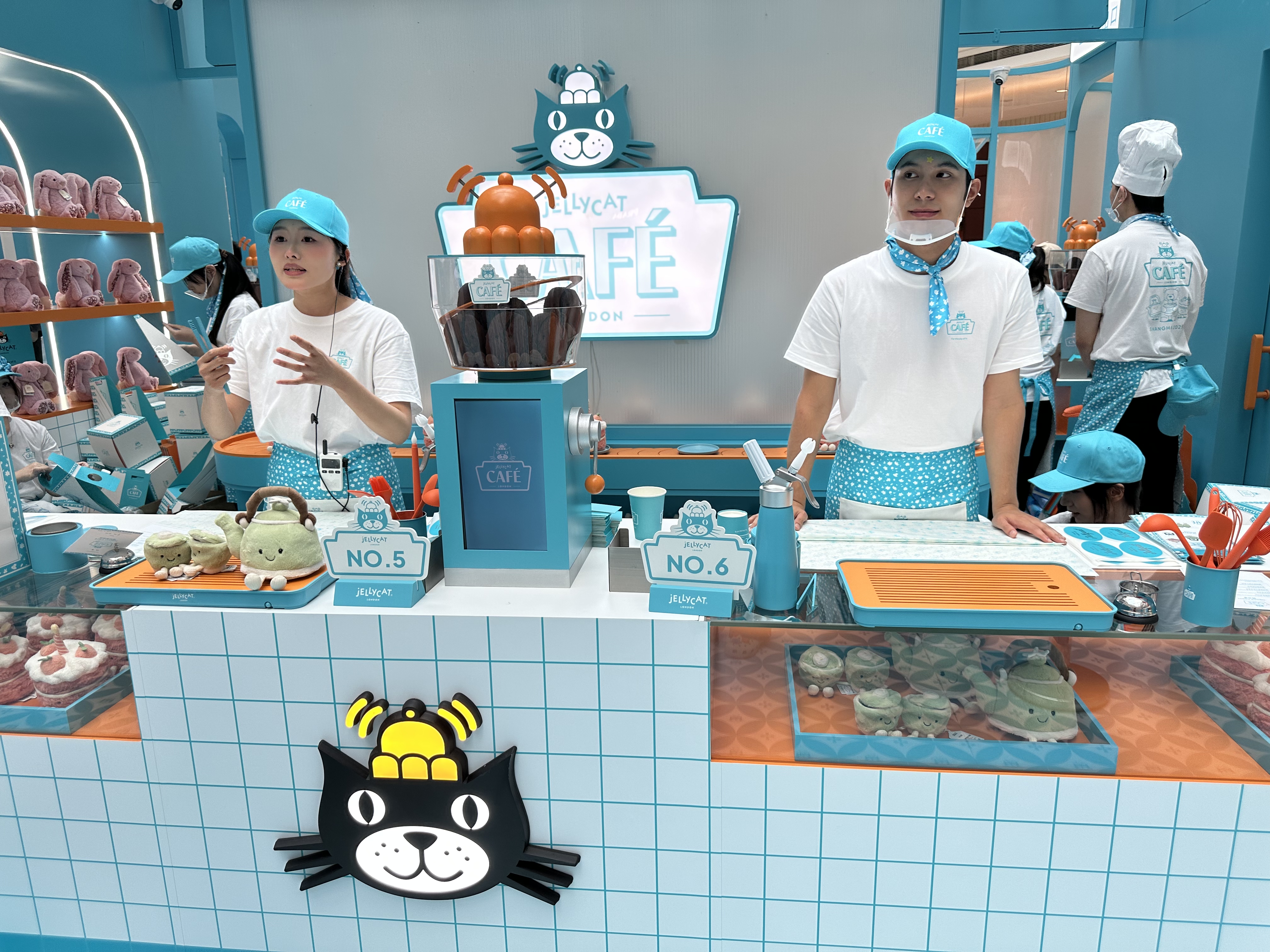 Jellycat的与众不同之处在于仪式感,比如上述这家Jellycat咖啡店,笔者在现场看到,其实店内都是毛绒玩具,但因为是咖啡店主题,因此店内所有的玩具都是食物造型,包括各类糕点、咖啡与茶饮等,甚至还做了“烤箱”等设备,将部分糕点造型的玩具放置在“烤箱”内,营造“现烤食物”的氛围感。最绝的是买单环节,当顾客买了咖啡店限定款茶壶、茶杯、蛋糕、拿铁等造型的毛绒玩具后,店员会在打造成咖啡店食品结账柜台的打包处开始表演,把毛绒蛋糕玩具“点上蜡烛”,请顾客许愿,然后装入糕点盒,再拿出茶具玩具,给顾客“泡茶”,给拿铁造型玩具现场“打奶油”……这一系列表演其实就是完成一套仪式感,让顾客有“过家家”的感觉。