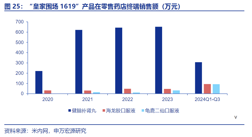 1)“皇家围场 1619”,战略布局男士滋补健康新赛道。旗下现有重点品种包含健脑补肾口服液、龟鹿二仙口服液、海龙胶口服液等独家批文产品,龟甲胶、鹿角胶等医保产品,固本培元,拓展补肾养生新人群,打造男士健康活力第一品牌。