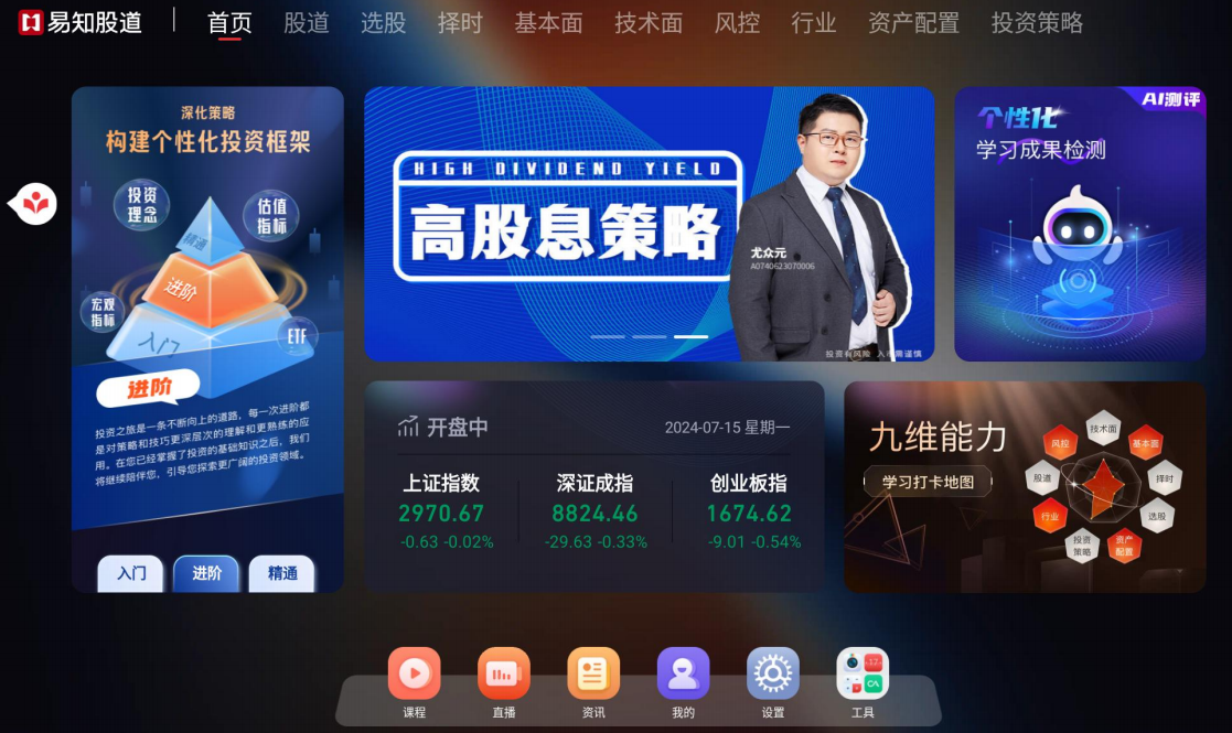 然而,股市有风险。10月9日,A股三大指数集体回调,截至收盘,沪指跌6.62%,深成指跌8.15%,创业板指跌10.59%,北证50指数跌12.11%,全市场超5000只个股下跌。这提醒着广大投资者要时刻保持警惕,扎实的股票知识和正确的投资策略必不可少,善于借用工具方可“事半功倍”。谈及投资工具,今年九方智投控股旗下九方智投推出的“易知股道”股票学习机就是为投资者打造的专属学习平台,助力投资者提升股票投资能力。