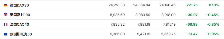 2. 截至发稿,德国DAX指数跌0.91%,英国富时100指数跌0.45%,法国CAC40指数跌0.85%,欧洲斯托克50指数跌0.95%。