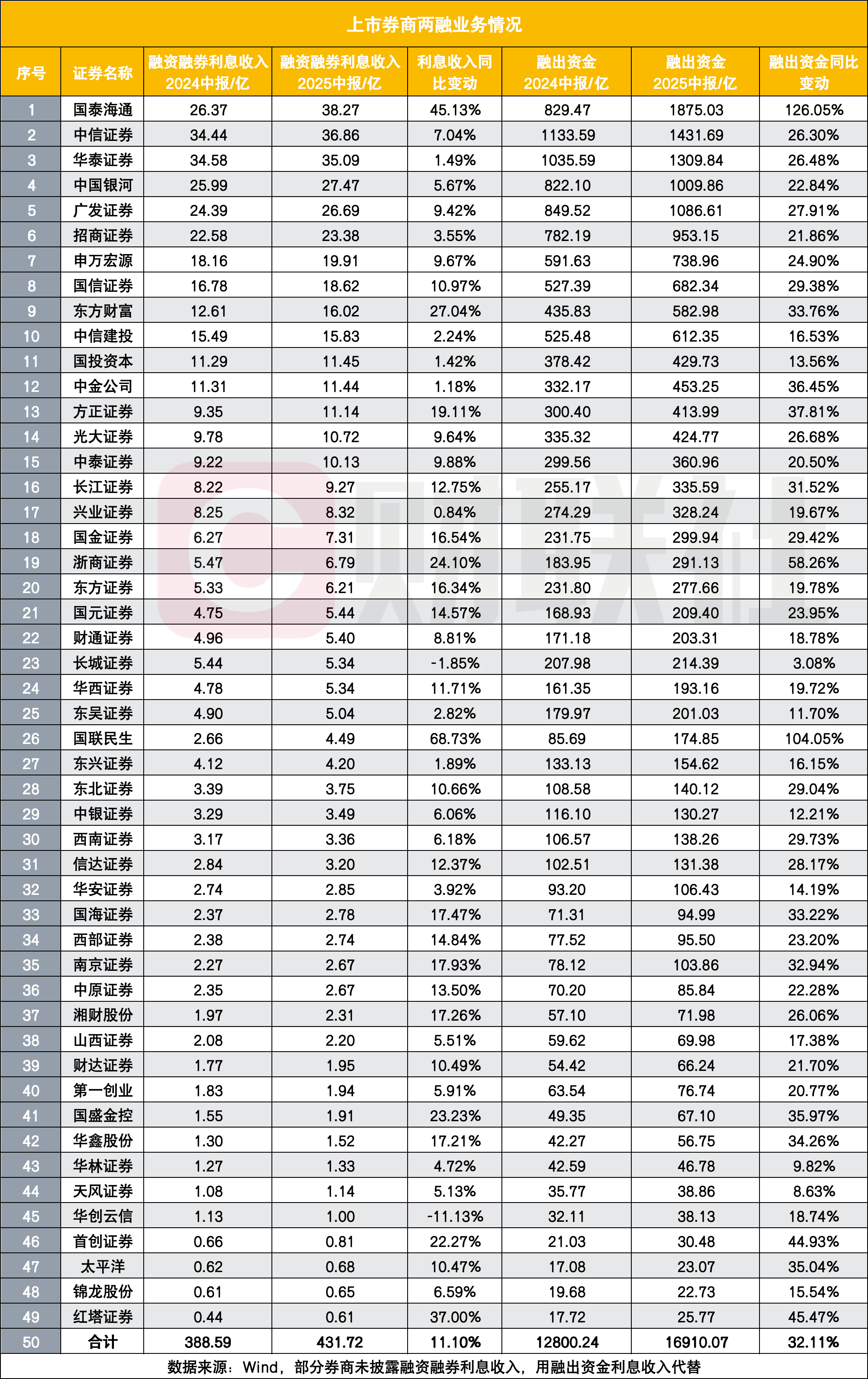 在券商财务报表中,“融出资金”科目的核心构成是“融资融券业务融出资金”,可以反应券商两融规模的变化。数据显示,49家券商2025年中报融出资金合计较去年同期增长超30%,其中33家券商融出资金同比增幅超过20%。