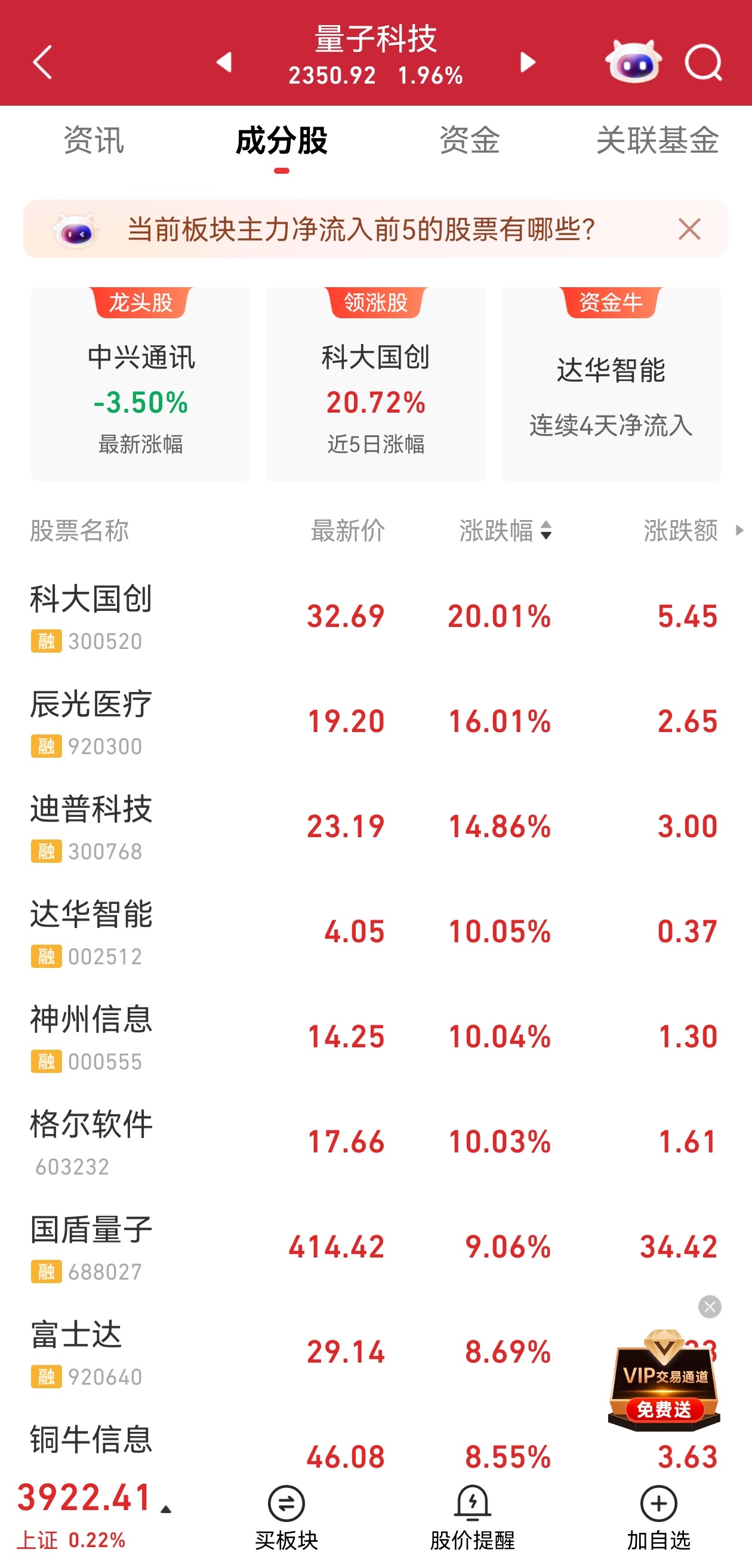 尾盘,量子科技板块直线拉升。科大国创“20CM”涨停,达华智能、神州信息直线涨停,迪普科技、辰光医疗、国盾量子等跟涨。