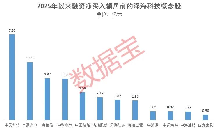从融资净买入额来看,2025年以来,9只概念股融资净买入额过亿元。中天科技最高,为7.92亿元;亨通光电随后,为5.35亿元;海兰信、中科电气融资净买入金额均超3亿元。