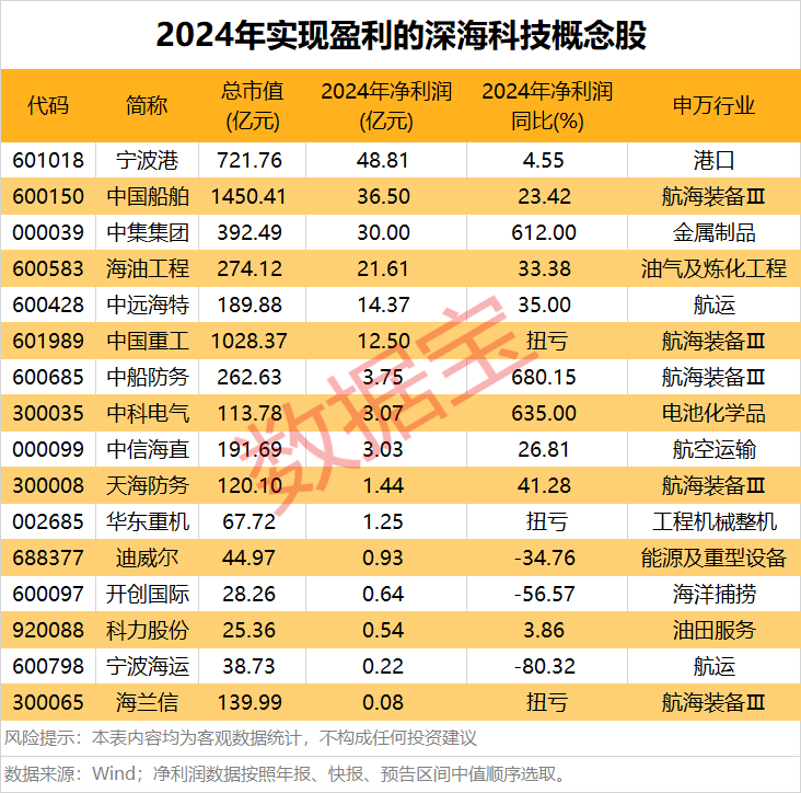 证券时报·数据宝梳理了2024年实现盈利的深海科技概念股,共计16股。
