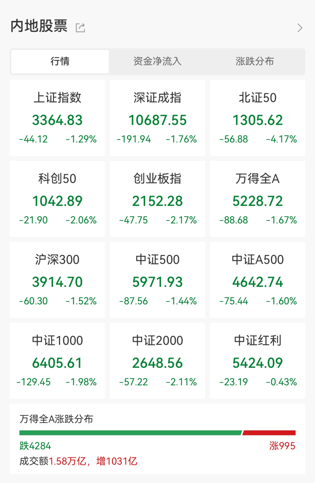 3月21日,A股全天震荡调整。沪指下跌1.29%,失守3400点关口,报3364.83点;深证成指跌1.76%,创业板指跌2.17%。沪深京三市共4284股下跌,995股上涨。今日成交总额15797.48亿元,较昨日放量约1031亿元,换手率3.81%。