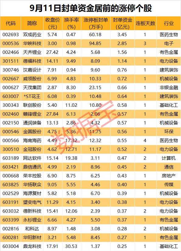 以封单金额计算,4股封单资金超亿元,双成药业、华映科技、天齐锂业封单资金居前,分别为3.45亿元、2.85亿元、1.56亿元。