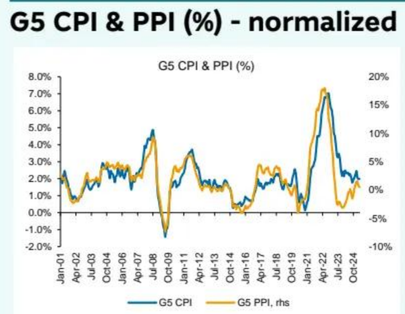 除中国出现一些波动外,美国、英国、欧元区和日本的通胀在近三十年来一直保持着惊人的一致性:20世纪90年代至2020年以通缩趋势为主,随后在2021-2022年因全球疫情出现同步飙升,并在2023-2024年同样快速回落。