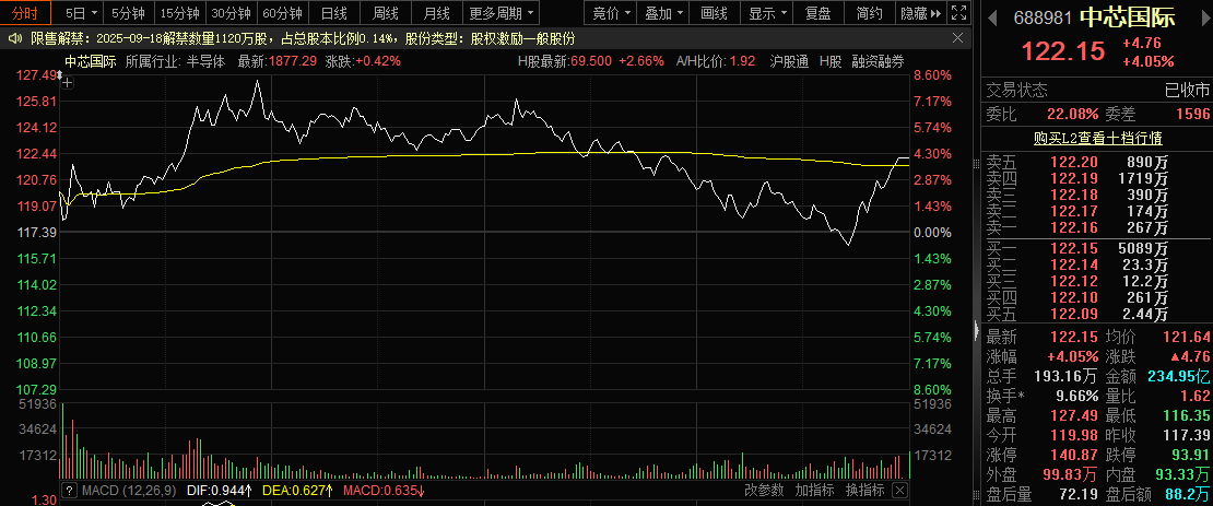美股半导体巨头盘前大涨的同一天,A股半导体板块也足够吸睛。9月18日上午,中芯国际(688981.SH)股价盘中一度冲高至127.49元/股,创历史新高,总市值突破1万亿元。之后其股价回落至122.15元,总市值收报9771亿元。