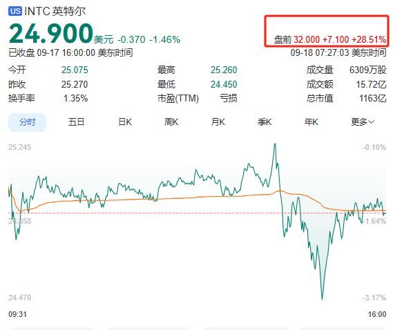英特尔美股盘前短线拉升,一度涨超29%,截至发稿,英特尔美股盘前涨28%。