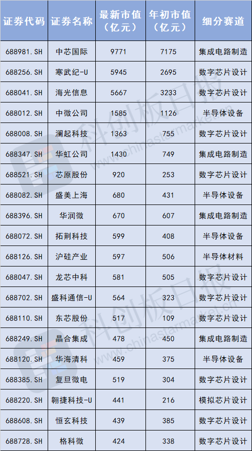 据统计,今年至今(截至9月18日收盘),科创板半导体板块总市值持续上涨,50家公司最新市值总和为4.14万亿元,较今年初市值总和增长1.52万亿元。其中,市值突破500亿的公司数量从年初的9家增长到最新的14家,新增5家分别为盛美上海、拓荆科技、盛科通信、芯原股份、东芯股份。