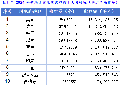 从主要出口国家和地区数据来看,2024年,美国是中国电池产品出口的第一大市场,出口额为160.1亿美元,占中国电池出口总额的23.9%。德国是中国电池产品出口的第二大市场,出口额105.6亿美元,占中国电池出口总额的15.8%。韩国是第三大市场,出口额38.48亿美元,占总额的5.7%。