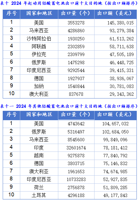 铅酸电池是占我国电池出口额第二的品类。得益于全球汽车产量从疫情中恢复并持续爬坡,起动用铅酸蓄电池出口额和出口量在五年间保持稳定增长。其他铅酸蓄电池在2023和2024期间受到其它先进电池替代、激烈的价格竞争与成本压力、企业海外布局转移、贸易摩擦等原因表现为“量增额减”。考虑到人民币汇率、贸易环境以及国内电池企业在海外扩产的趋势,中国铅蓄电池出口总量增速预计将放缓。随着全球汽车产业电动化转型,以及储能市场的发展,铅酸蓄电池的需求结构也会随之变化。