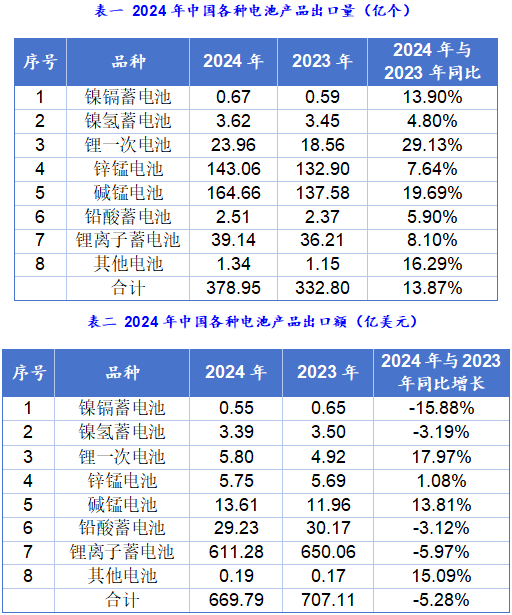 中国化学与物理电源行业协会行业发布《2024年中国电池产品出口统计分析》。数据显示,2024年中国各种电池品种出口总量为378.95亿个,2023年出口总量为332.80亿个,同比增长13.87%。2024年中国各种电池品种出口额为669.79亿美元,2023年出口额为707.11亿美元,同比减少5.28%。其中,锂离子蓄电池出口额占91.3%,铅酸蓄电池出口额占4.4%,锌锰/碱锰电池出口额占2.9%,镍氢/镍镉蓄电池出口额占0.6%。
