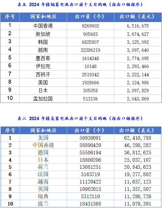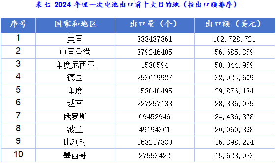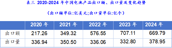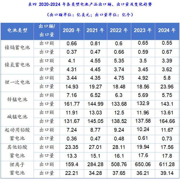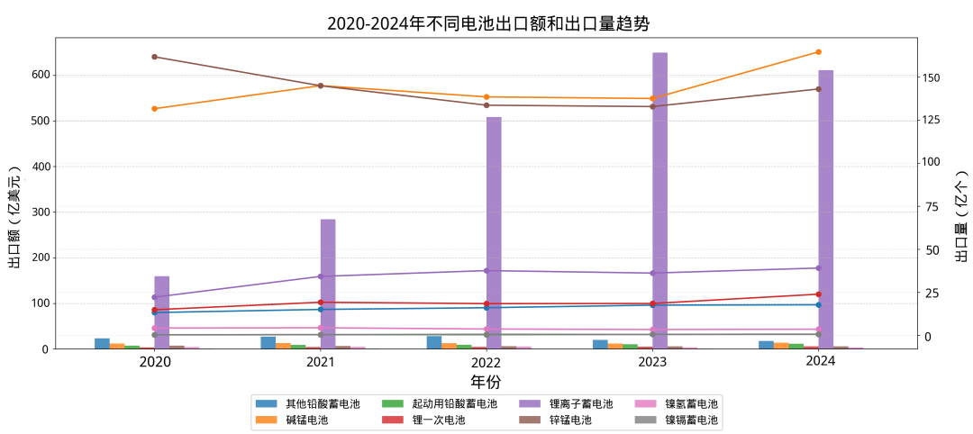 根据海关出口数据统计分析,近5年来,锂离子电池产品一直是中国电池产品出口的主要品种,作为出口“新三样”之一,出口额占比从2020年的73%到2023年的占比92%,逐年快速提升。2024年出口数量增长8.1%,出口额下降5.79%。呈现“量增价减”特征,主要受碳酸锂价格暴跌、美国IRA法案影响及结构性产能过剩等多重因素驱动。但锂离子电池仍然是拉动整体电池出口增长的核心动力。