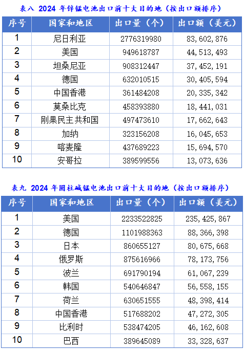 碱锰电池的出口量在五年间虽然有所波动,但整体保持了增长态势,尤其在2024年出现了显著提升,这表明其市场需求基本盘稳固且在扩大。与碱锰电池相反,锌锰电池的出口量从2020年至2023年连续下滑,尽管在2024年有所反弹。反映了碱锰电池逐步取代锌锰电池的行业趋势。
