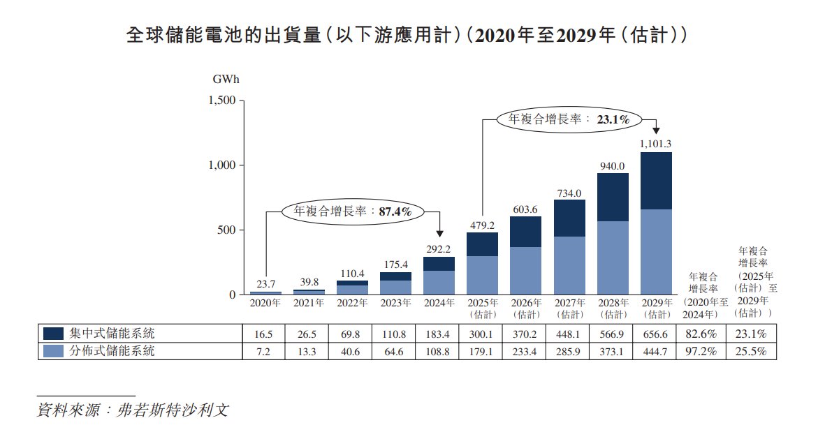 随着储能电池在电力消费、发电、输配电领域的广泛应用,从2020年到2024 年,全球储能电池年出货量从23.7GWh增至292.2GWh,年复合增长率为87.4%。随着全球大型可再生能源项目的不断推进,全球集中式储能电池的出货量在2024年增至 183.4GWh,预计到2029年将攀升至656.6GWh,2025年至2029年的年复合增长率为 23.1%。此外,为提高商业和生活场景下的用电效率,以及提高城市用电的稳定性和可持续性,预计2029年分布式储能电池出货量将达到444.7GWh,2025年至2029年的年复合增长率为25.5%。预计到2029年全球储能电池的年出货量将达到1,101.3GWh,2025年至2029年的年复合增长率为23.1%。