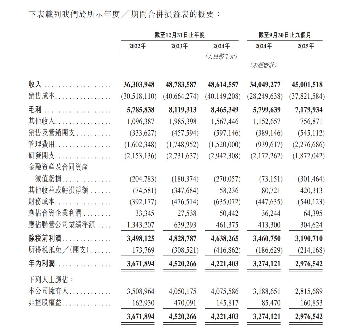 于2022年度、2023年度、2024年度以及2025年截至9月30日止九个月,公司录得年内利润分别约为36.72亿元、45.20亿元、42.21亿元、29.77亿元。