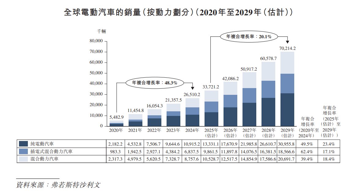 全球电动汽车销量由2020年的5,482.9千辆增至2024年的26,510.2千辆,年复合增长率达48.3%。在预测期内,得益于电动汽车的技术进步与创新、产业链的优化、多个国家的政策推广与支持,以及从化石能源向可再生能源的持续转型,到2029年,销量预计将进一步增至70,214.2千辆,2025年至2029年的年复合增长率为20.1%。按动力类型计,2020年至2024年,插电式混合动力汽车销量增长最快。插电式混合动力汽车销量由983.3千辆增至6,837.5千辆,年复合增长率达62.4%。预计其销量将于2029年进一步增至18,566.6千辆,2025年至2029年的年复合增长率达17.1%。