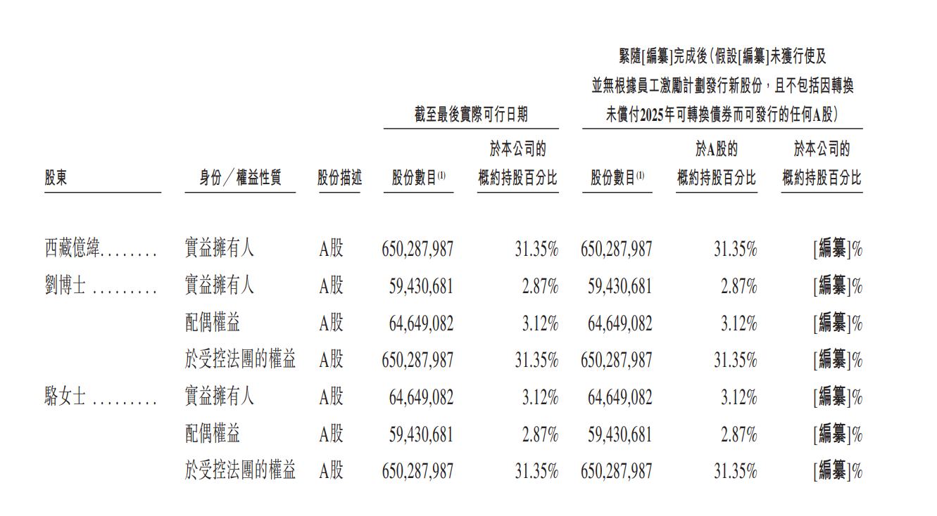 截至最后实际可行日期,公司已发行股本总额中,刘金成博士持有约2.87%,骆锦红女士(为刘博士的配偶)持有约3.12%,而西藏亿纬则持有约31.35%,西藏亿纬则由刘博士及骆女士各持有50%。因此,截至最后实际可行日期,刘博士、骆女士及西藏亿纬合共控制公司已发行股本总额约37.33%的投票权。