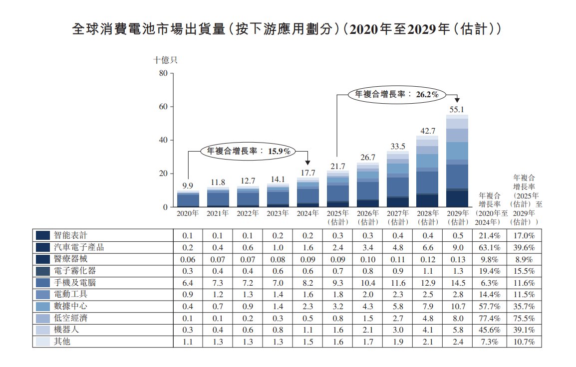 全球消费电池市场受技术驱动,具有需求多样化和政策利好的特点。从2020年到 2024年,全球消费电池总出货量由99亿只增至177亿只,年复合增长率为15.9%。这一增长源于消费电子产品和汽车电子等下游产业的扩张以及电池技术的升级。未来,5G 设备的普及和低空经济将继续推动需求。据估计,出货量将由2025年的217亿只增至 2029年的551亿只,年复合增长率达到26.2%,表明市场将持续扩大。