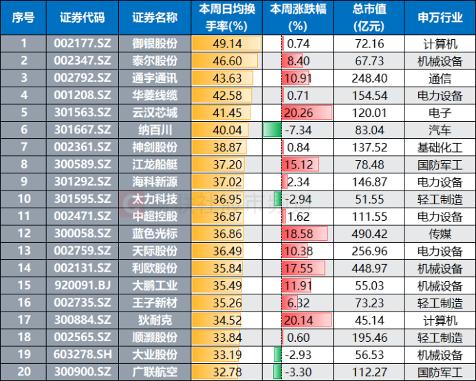 此外,从换手数据上看,剔除新股影响,周内累计共有29股日均换手率在30%以上。其中,御银股份、泰尔股份、通宇通讯、华菱线缆、云汉芯城、纳百川6股日均换手率数据超40%。行业层面来看,这29只高换手率股主要集中在机械设备、国防军工、电力设备板块,同时,计算机、轻工制造、电子、基础化工股数量也相对较多。