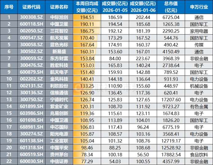 作为市场瞩目的风向标,A股成交额排行榜前列的标的一直是投资者关注焦点。从周内行情上看,累计共有22股在近2个交易日期间单日成交额一度突破100亿元,其中,17股每日成交额均超100亿元,为“百亿成交”常客。具体标的来看,2025年的热股中际旭创在今年依旧保持高热状态,中国卫星、三花智控、航天发展、蓝色光标等股近日也热度较高。