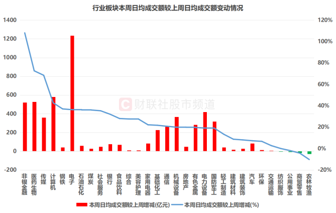 按行业统计,31个申万一级板块中,累计共有27个板块本周(1月5日至6日)日均成交额较上周(12月29日至31日)有所增长,整体占比近87%。其中,非银金融、医药生物、传媒板块成为开年资金重点“扫货”方向,本周日均成交额较去年最后一周分别增长108%、73%、68%,电子、石油石化、煤炭、社会服务、银行板块成交额也有超3成增长。