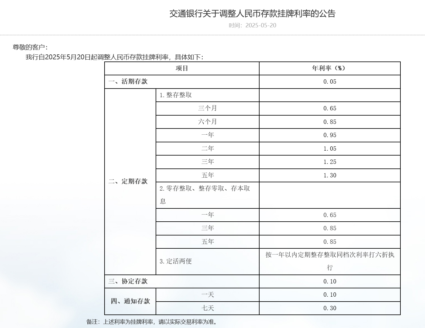 交通银行下调人民币存款利率,其中活期利率下调5个基点至0.05%;定期整存整取三个月期、半年期、一年期、二年期均下调15个基点,分别为0.65%、0.85%、0.95%、1.05%;定期整存整取三年期和五年期均下调25个基点,分别至1.25%和1.3%。定期零存整取、整存零取、存本取息三种期限均下跌15个基点。7天期通知存款利率下调15个基点至0.3%。