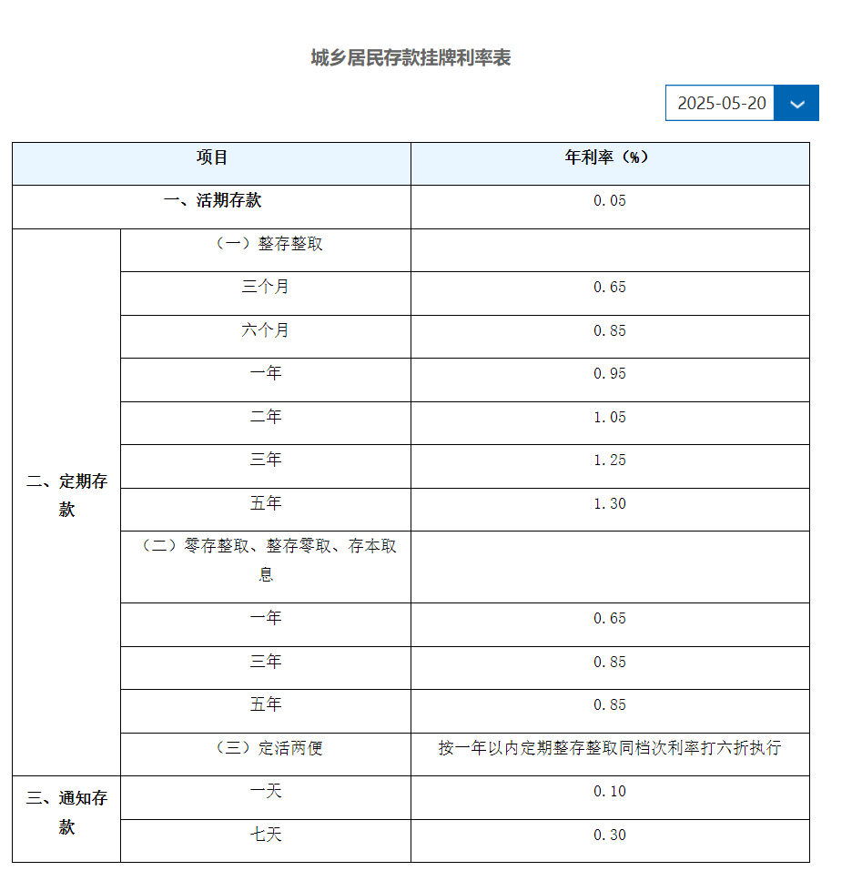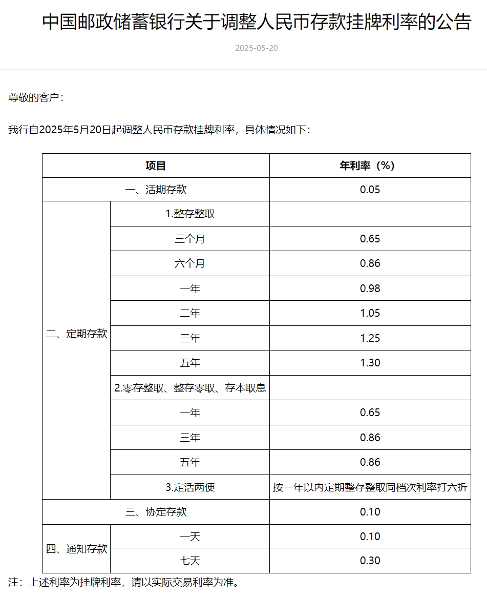 邮储银行对多个期限的人民币存款利率进行了下调,其中活期存款利率下调至0.05%;定期三个月期、半年期、一年期、三年期和五年期均有下调,分别为0.65%、0.86%、0.98%、1.25%和1.30%。