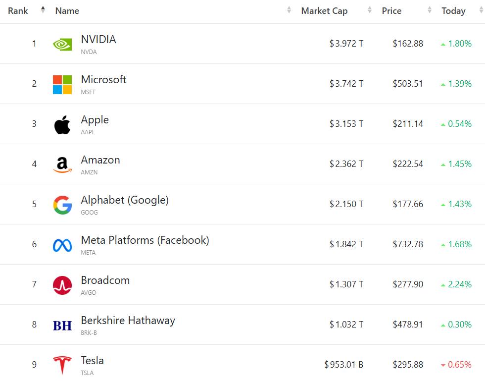 科技巨头整体走强,“七巨头”中仅特斯拉一家下跌。英伟达收涨1.8%,盘中一度涨近2.8%至164.42美元,总市值短暂突破4万亿美元,成为全球第一家达到这一里程碑的公司。