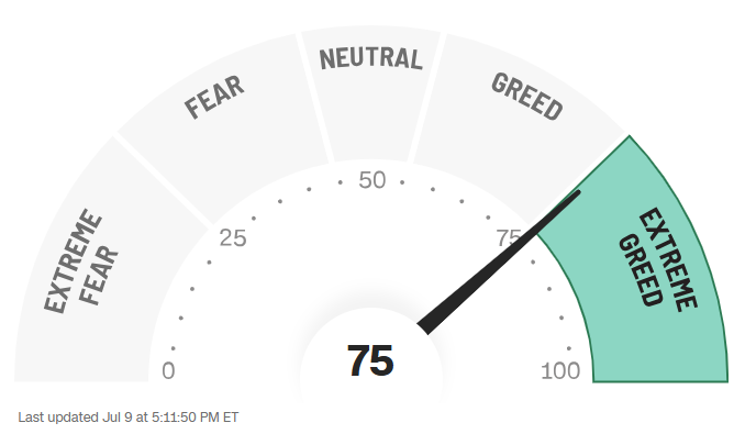 截至美股收盘,“恐惧与贪婪指数”略高于75,位于“极度贪婪”区域——代表交易员已无视贸易焦虑,同时比特币首次突破11.2万美元/枚,也反映出市场风险偏好。