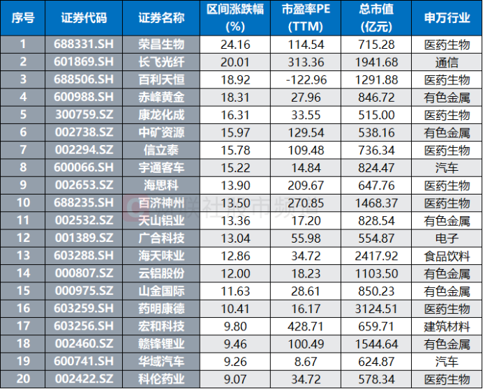 不过,也有部分权重股近日迎来拉涨。截至4月1日收盘,累计共有16只500亿元以上市值股近5日涨幅超10%。其中,荣昌生物、长飞光纤唯二涨幅超20%,百利天恒、赤峰黄金、康龙化成、中矿资源、信立泰等股也涨幅居前。分行业板块来看,其主要集中在医药生物、有色金属板块,两者合计占比75%。