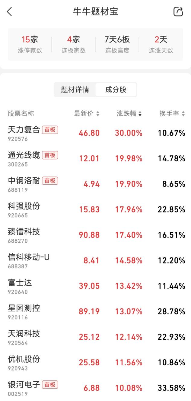 因此,在这个背景下,无论是看好商业航天前景的,还是下跌时的抱团资金,都进入了商业航天板块。天力复合触及30cm涨停,此前通光线缆、中钢洛耐、中超控股、普天科技等十余股涨停,信科移动、臻镭科技、科强股份均涨超10%。