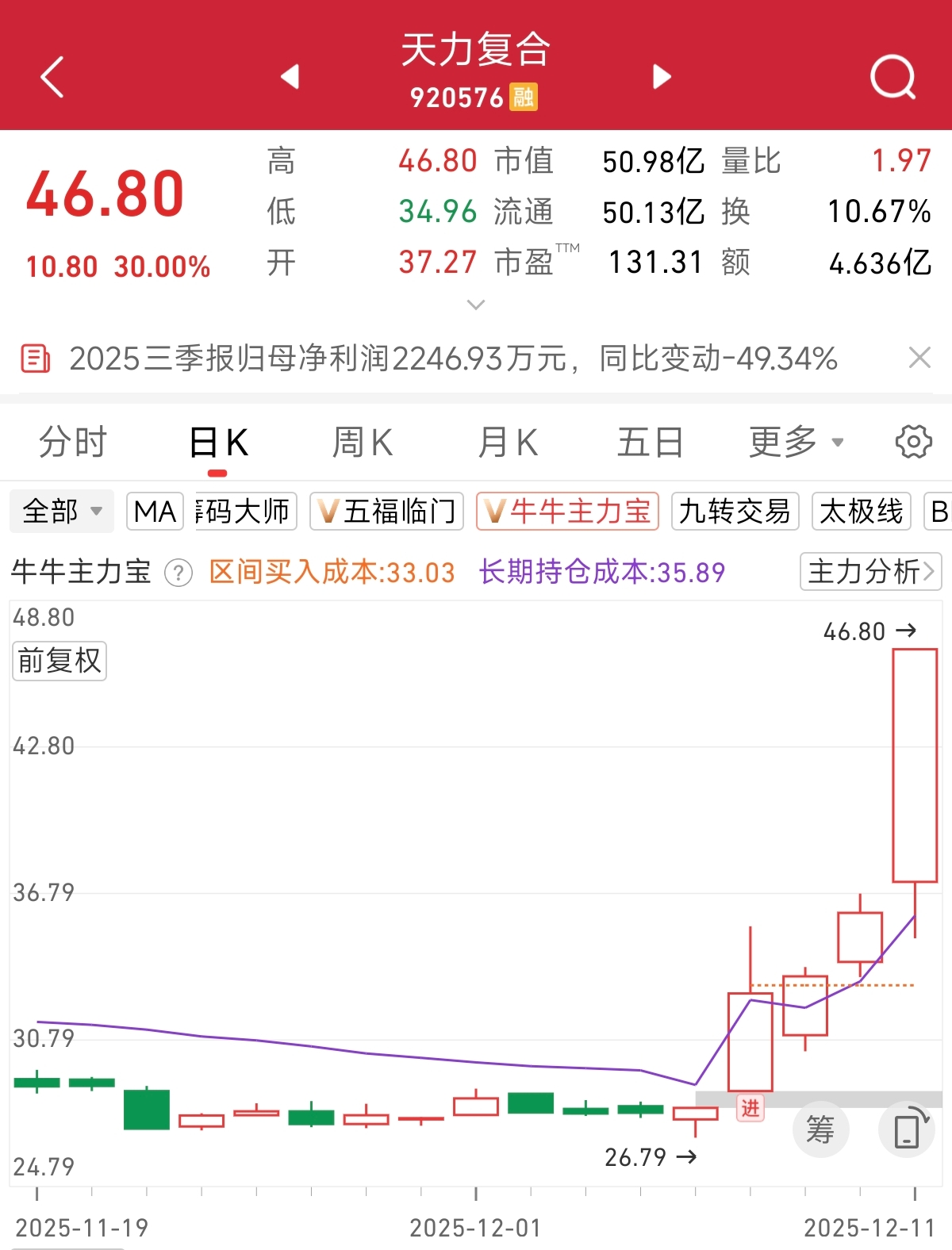 根据主力宝监控,今天30cm涨停的天力复合在12月8日发出主力加仓信号后,到现在已经上涨41%。