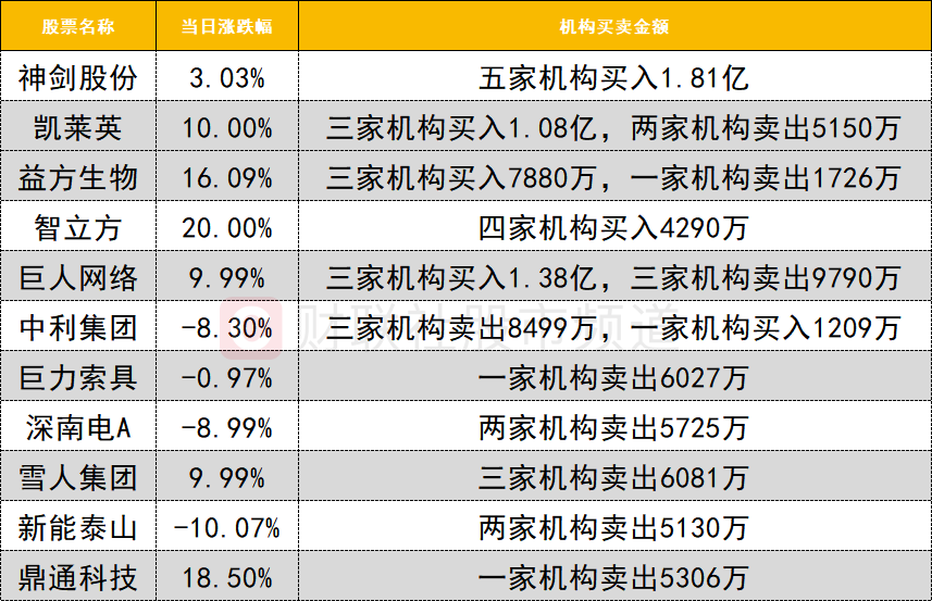 今日龙虎榜机构活跃度较高,商业航天人气股神剑股份获五家机构买入1.81亿。医药板块强势爆发,其中凯莱英获三家机构买入1.08亿,同时遭两家机构卖出5150万。