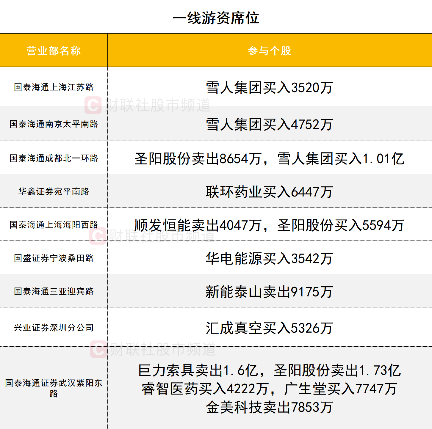 一线游资活跃度较高,可控核聚变概念股雪人集团尾盘涨停,获三家一线游资(国泰海通证券成都北一环路、国泰海通证券南京太平南路、国泰海通证券上海江苏路)合计买入1.83亿。圣阳股份获一家游资(国泰海通证券上海海阳西路)买入0.55亿,而同时遭两家游资(国泰海通证券武汉紫阳东路、国泰海通证券成都北一环路)合计卖出2.59亿。