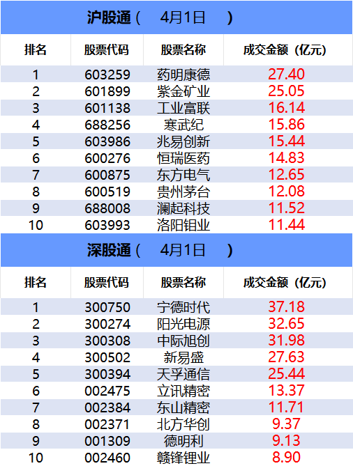 从沪股通前十大成交个股来看,药明康德位居首位;紫金矿业和工业富联分居二、三位。