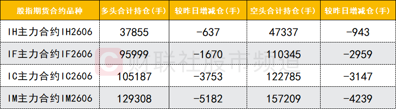 四大期指主力合约中,IH、IF、IC、IM合约多空双方均减仓,IF合约空头减仓数量较多,IM合约多头减仓数量较多。