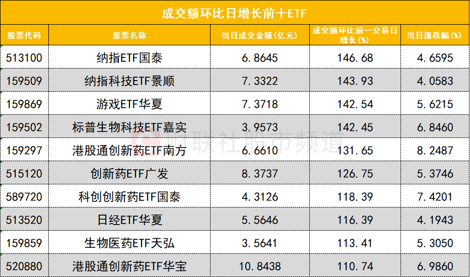 从成交额前十的ETF来看,港股创新药ETF广发(513120)成交额位居首位,黄金ETF华安(518880)成交额位居次席。