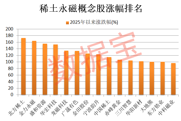 数据宝统计,在一系列利好刺激下,稀土永磁概念股二级市场走势不俗。截至10月13日收盘,今年以来稀土永磁概念股平均上涨76.35%,北方稀土、金力永磁、盛和资源、华宏科技、龙磁科技累计涨幅排在前五位。