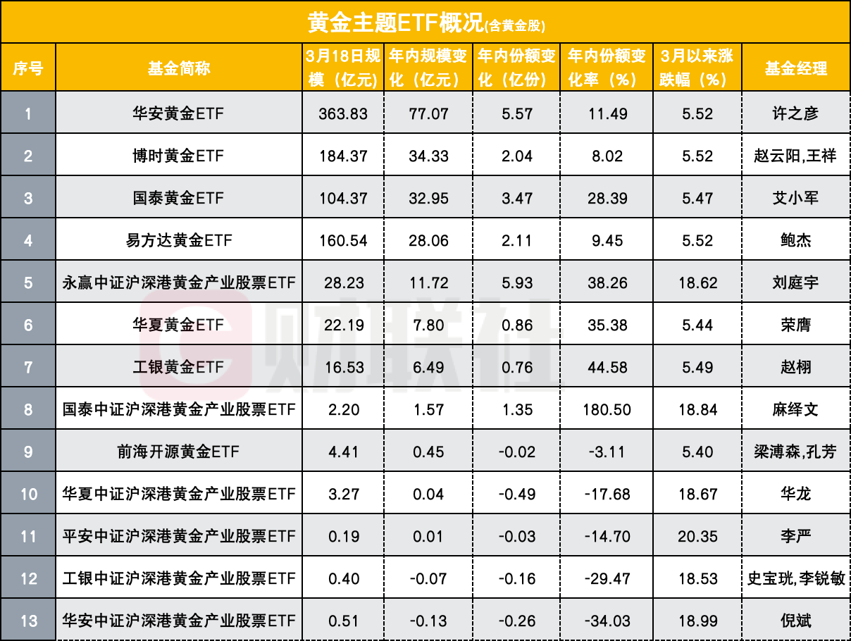 不仅如此,3月以来,平安、华安、国泰、华夏和永赢旗下中证沪港深黄金产业股票ETF涨幅已分别达20.35%、18.99%、18.84%、18.67%、18.62%。从年内的情形看,上述产品中有不少实现规模增长,其中永赢中证沪港深黄金产业股票ETF规模增长11.72亿元,国泰、华夏、平安旗下中证沪港深黄金产业股票ETF年内规模分别增长1.57亿元、0.05亿元、0.01亿元。